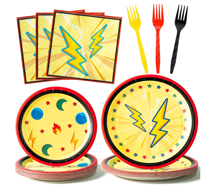 • Great Value Set:Package includes 24 cartoon lightning bolts themed party dinner plates (9 in) , 24 cartoon lightning bolts themed party dessert plates (7 in) , 24 cartoon lightning bolts themed party napkins (6.5 in) , 24 plastic forks (8 each black, yellow and red) , this set can serve 24 guests.