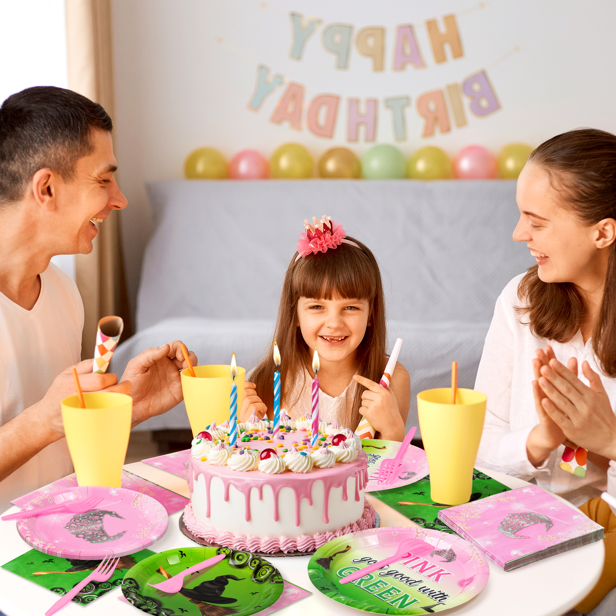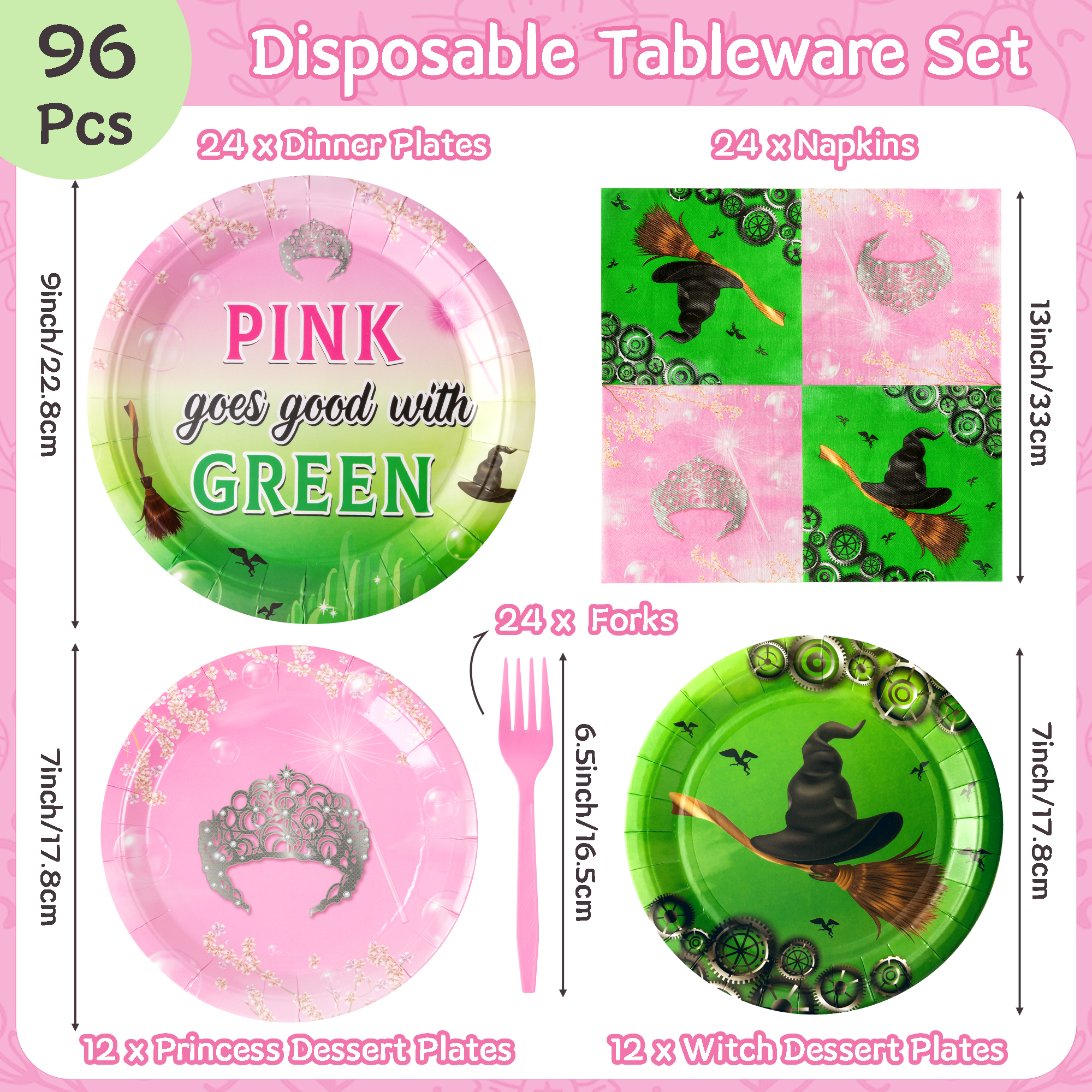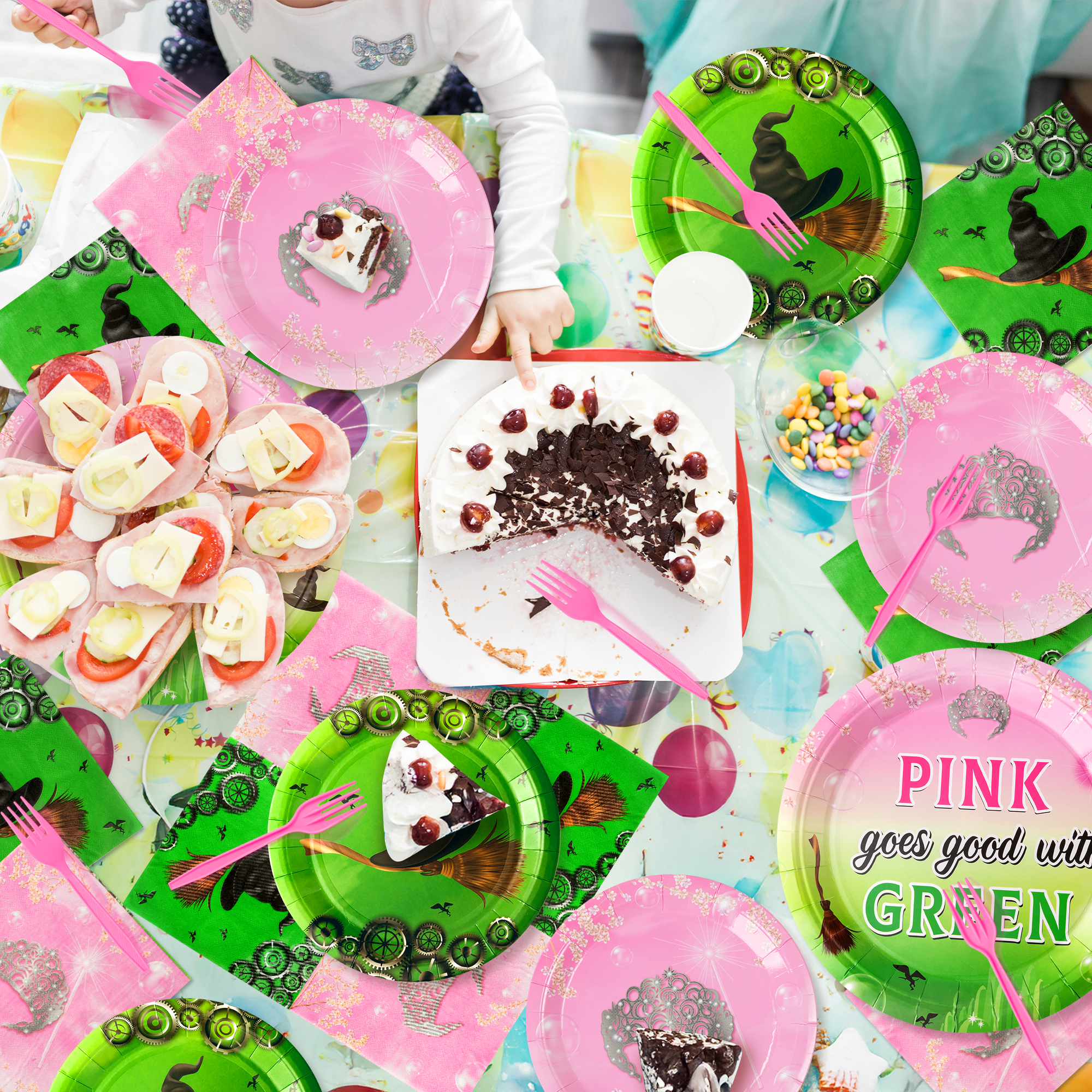 • Unique Themed Patterns: This party tableware set is printed with princess crowns and witch hats theme pattern, such as birthday cakes, flower, witch hat, princess crowns, stars and so on, it looks interesting and suitable for theme party to add pink and green theme atmosphere!